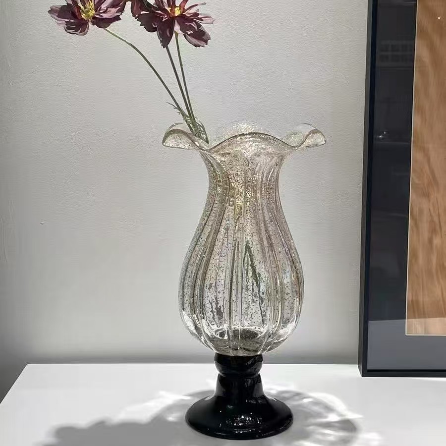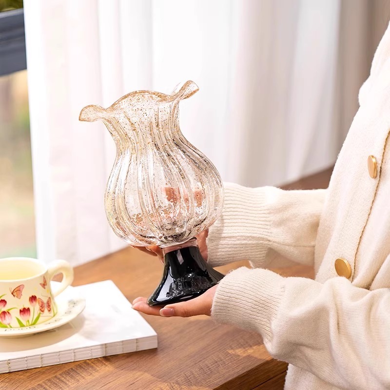 उत्पादनको नाम: लक्जरी गोल्ड-स्प्रिन्क्ल्ड भिन्टेज टल ग्लास फूलदान